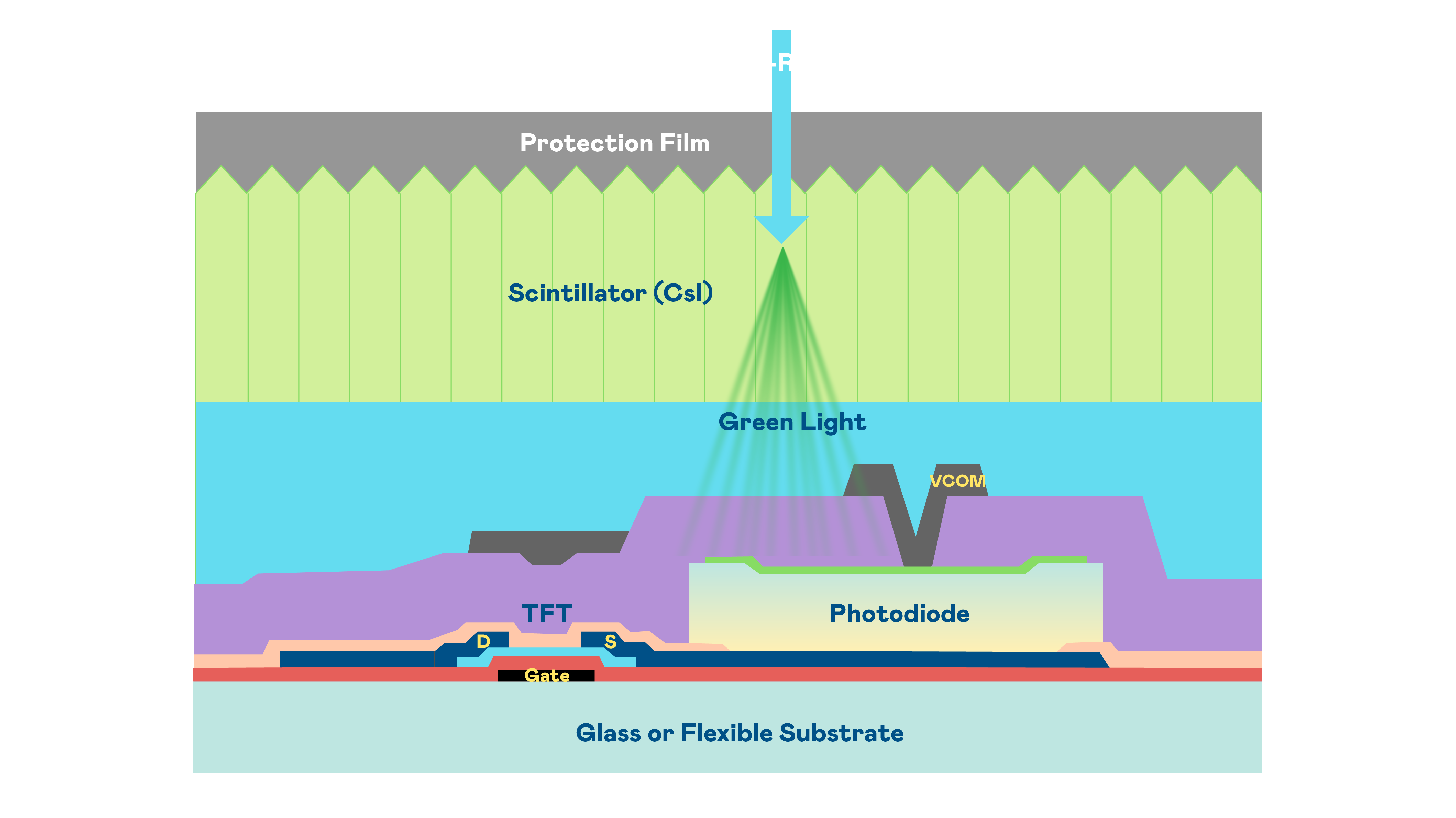 6008集团的X光影像感测阵列使用薄膜电晶体 (TFT) 作为每个像素的读取开关,搭配光电二极体(Photodiode)的光电转换元件,用以感测X光影像讯号。